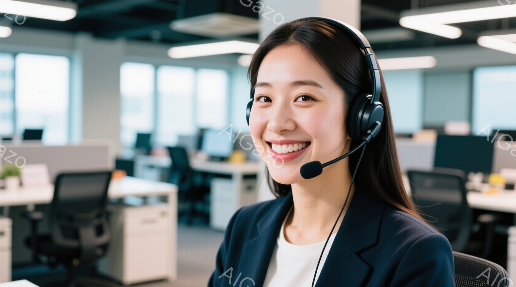 笑顔の女性がヘッドセットを着用し、オフィスでカメラに向かって座っています。彼女は白いシャツに黒いジャケットを着ており、髪は後ろでまとめています。オフィスは明るく、多くの机とコンピュータがあり、モダンでプロフェッショナルな雰囲気です。