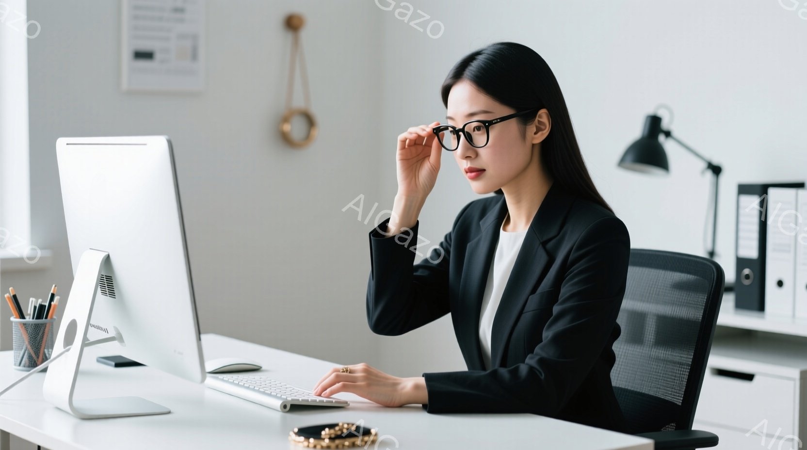 黒いジャケットと白いブラウスを着た女性が椅子に座り、眼鏡を外そうとしています。彼女は真剣な表情で、オフィス環境の中にいます。背景には、白い収納棚とノートパソコン、そしてデスクライトが見え、全体的に洗練された落ち着いた雰囲気です。