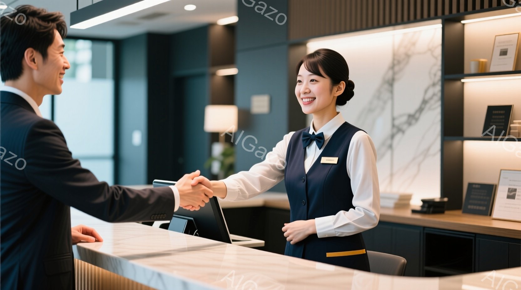 レセプションカウンターで、笑顔の女性スタッフが男性客と握手しています。女性は紺色のベストに白いブラウス、濃い青のリボンタイという制服を着ており、髪は後ろでまとめています。背景には、大理石調のカウンターと棚、そして温かみのある照明が映り、全体的に洗練された雰囲気です。
