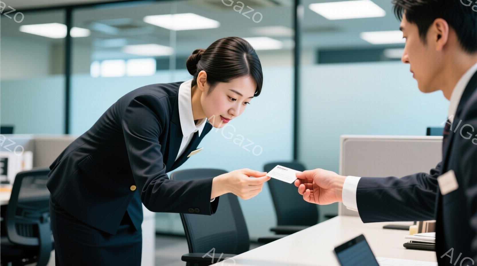 黒いスーツに身を包んだ女性が、白いカードを手に持って注意深く見ています。彼女は少し前かがみの姿勢で、オフィス内のデスクに置かれた書類の近くに立っており、真剣な表情を浮かべています。背景には、オフィス内の他のデスクや、窓から見える都市の風景が見え、全体的に落ち着いた雰囲気です。
