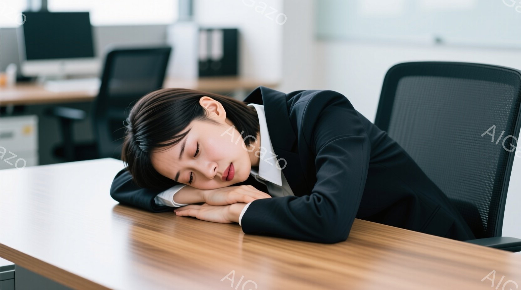 スーツを着た若い女性が、オフィスのデスクに肘をついてうつ伏せになり、眠っているように見える。彼女はダークブラウンの短い髪をしており、疲れた表情で目を閉じている。背景には他のオフィスデスクが見え、オフィス全体が静かで、少し疲労感のある雰囲気である。