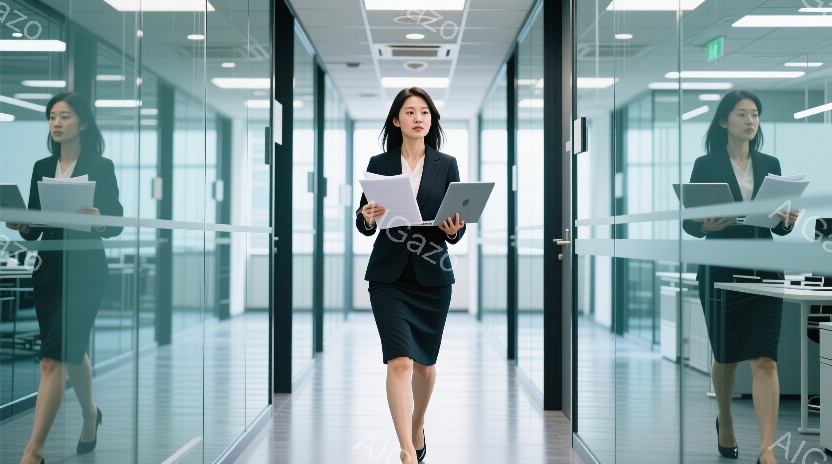 一人の女性がオフィス内を歩いている。黒いスーツと膝丈のスカート、ヒールを履き、手に書類を二枚持っている。背景はガラス張りのオフィスで、モダンで清潔感のある雰囲気が漂っている。
