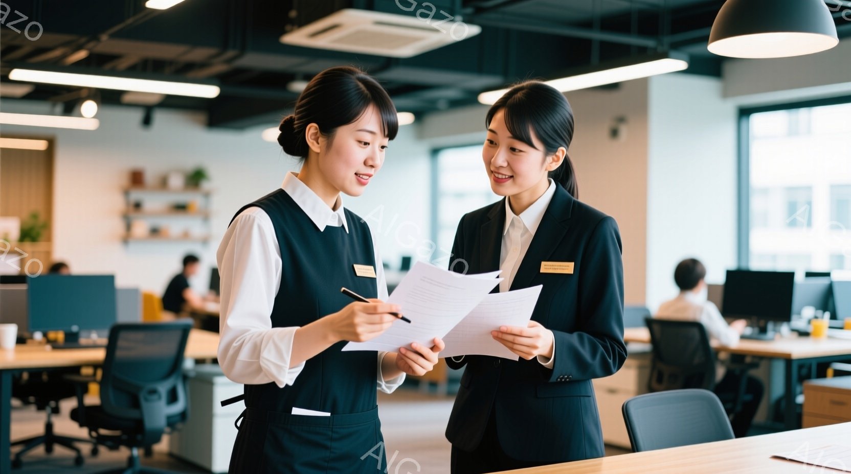 2人の若い女性が書類を見ながら話しています。一人は紺色のスーツに黒髪で、書類を指差して何かを説明しているようです。もう一人は黒のベストと白のシャツを着ており、同じように書類を見つめながら、真剣な表情で聞いています。
