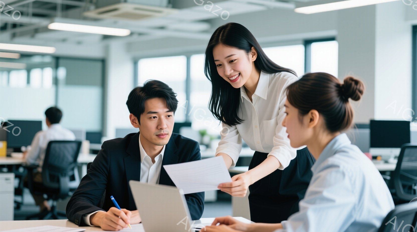 この無料AI生成画像「オフィスで女性が椅子に座り、両手を横に広げてストレッチをしている様子が写っている。彼女は白いブラウスにネイビーのベスト、そして名札をつけており、髪はきっちりと後ろでまとめている。背景には木製のデスクや書類、観葉植物が見え、オフィス内は明るく清潔な雰囲気である。」は、2025年10月26日に作成されました。 サイズは 1664×928px の高解像度で、商用利用も可能なフリー素材として提供しています。