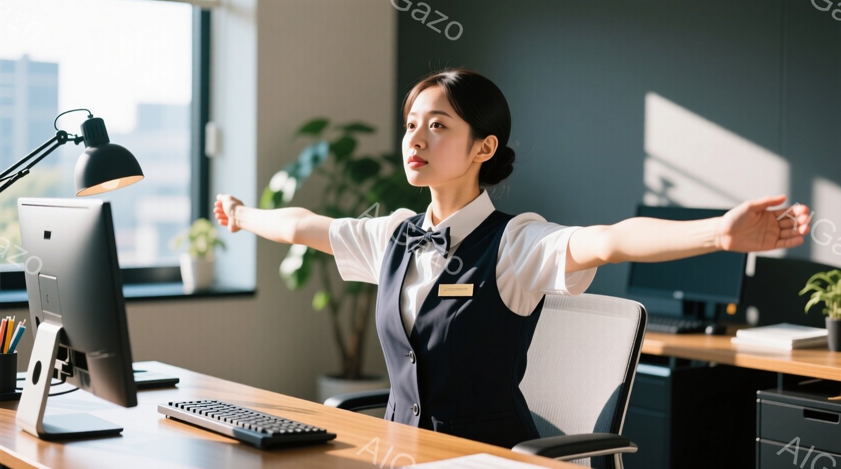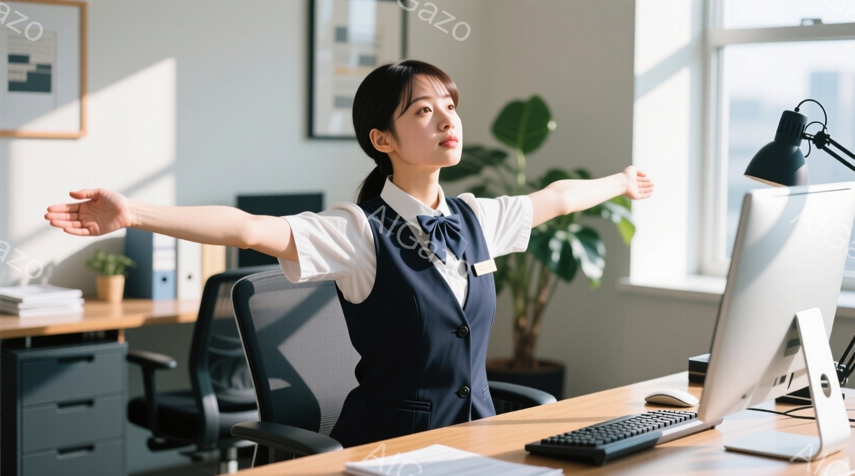 オフィスに座っている女性は、白いブラウスと濃い青のベストを着用し、ネクタイを結んでいます。彼女は両腕を横に広げ、ストレッチをしているようで、リラックスした表情をしています。背景には、机、コンピュータ、書類、そして窓の外にはオフィスビルが見え、明るい日差しが差し込んでいます。