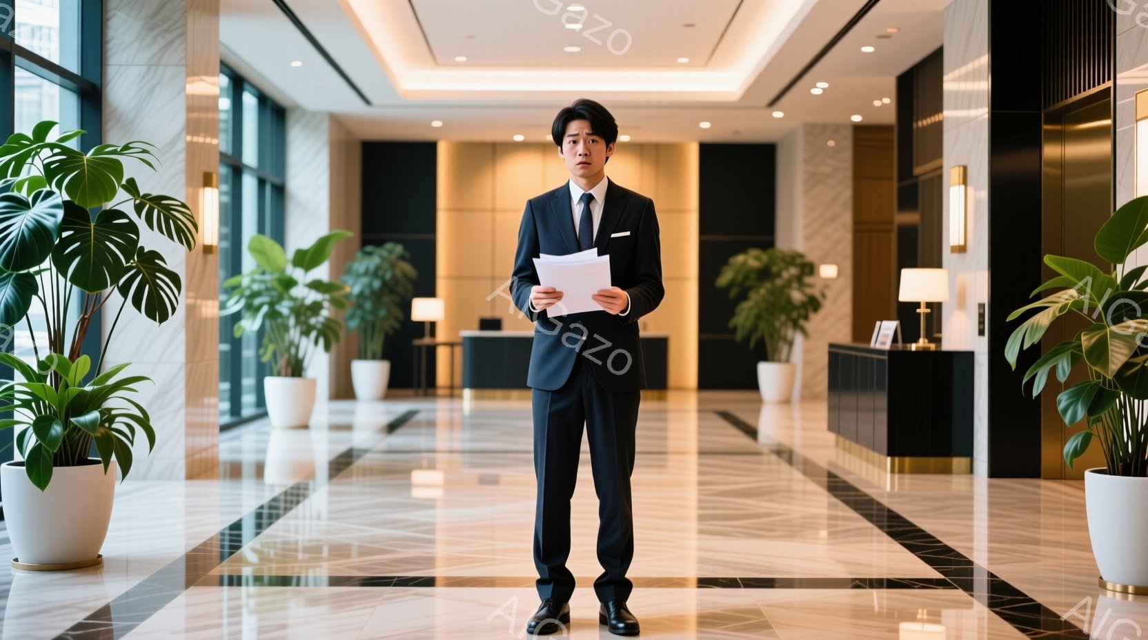 スーツを着た若い男性が、ロビーで書類を手に立っている。彼は真剣な表情で、正面を見据えており、姿勢もまっすぐで自信があるように見える。背景には、白いソファーや観葉植物が配置され、床は明るい色の模様が施された大理石で、高級感のあるホテルのロビーの雰囲気である。