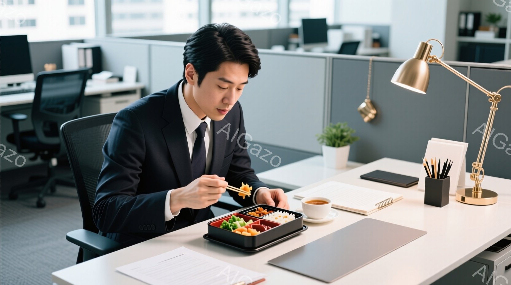 スーツとネクタイを着た男性が、オフィスで弁当を食べている。彼は少し前かがみになり、箸で弁当の中の食べ物を口に運んでいる様子で、真剣な表情をしている。背景には、オフィス内の他のデスクや備品が見え、室内は明るく清潔な印象を受ける。