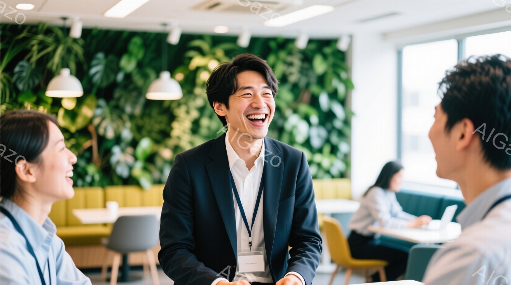紺色のスーツを着た男性が、笑顔で何かを説明している様子で、両手を広げてジェスチャーをしている。周囲にはノートパソコンを開いて座っている同僚たちがおり、背景には緑豊かな植物の壁が見えるオフィス空間が広がっている。全体的に明るく開放的な雰囲気で、活気のあるビジネスシーンが表現されている。