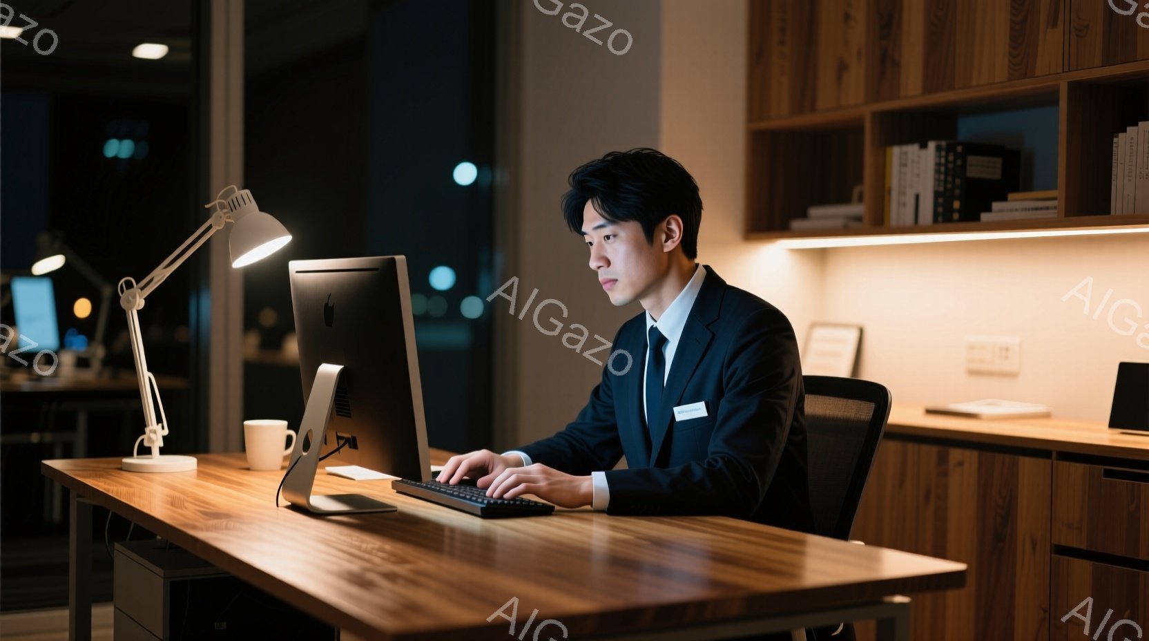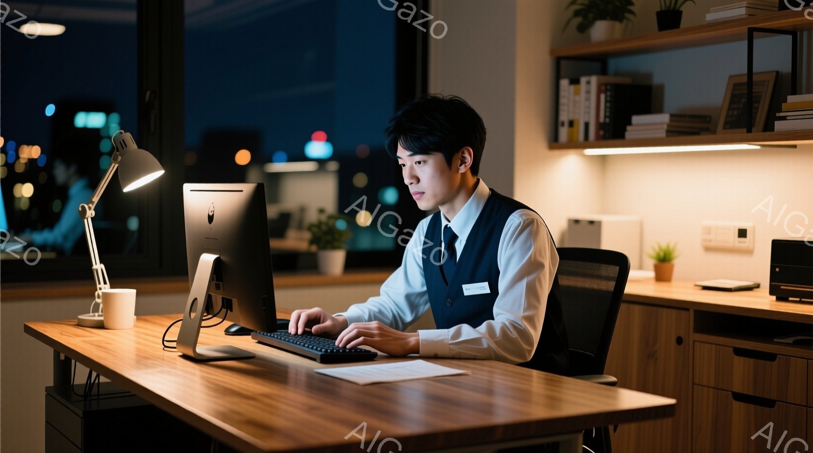 一人の男性がオフィスでパソコンに向かって作業している。彼は白いシャツに黒いベスト姿で、黒髪を短く整えている。背景には夜景がぼんやりと見え、室内はデスクライトの光で照らされ、集中して仕事に取り組む雰囲気が漂っている。