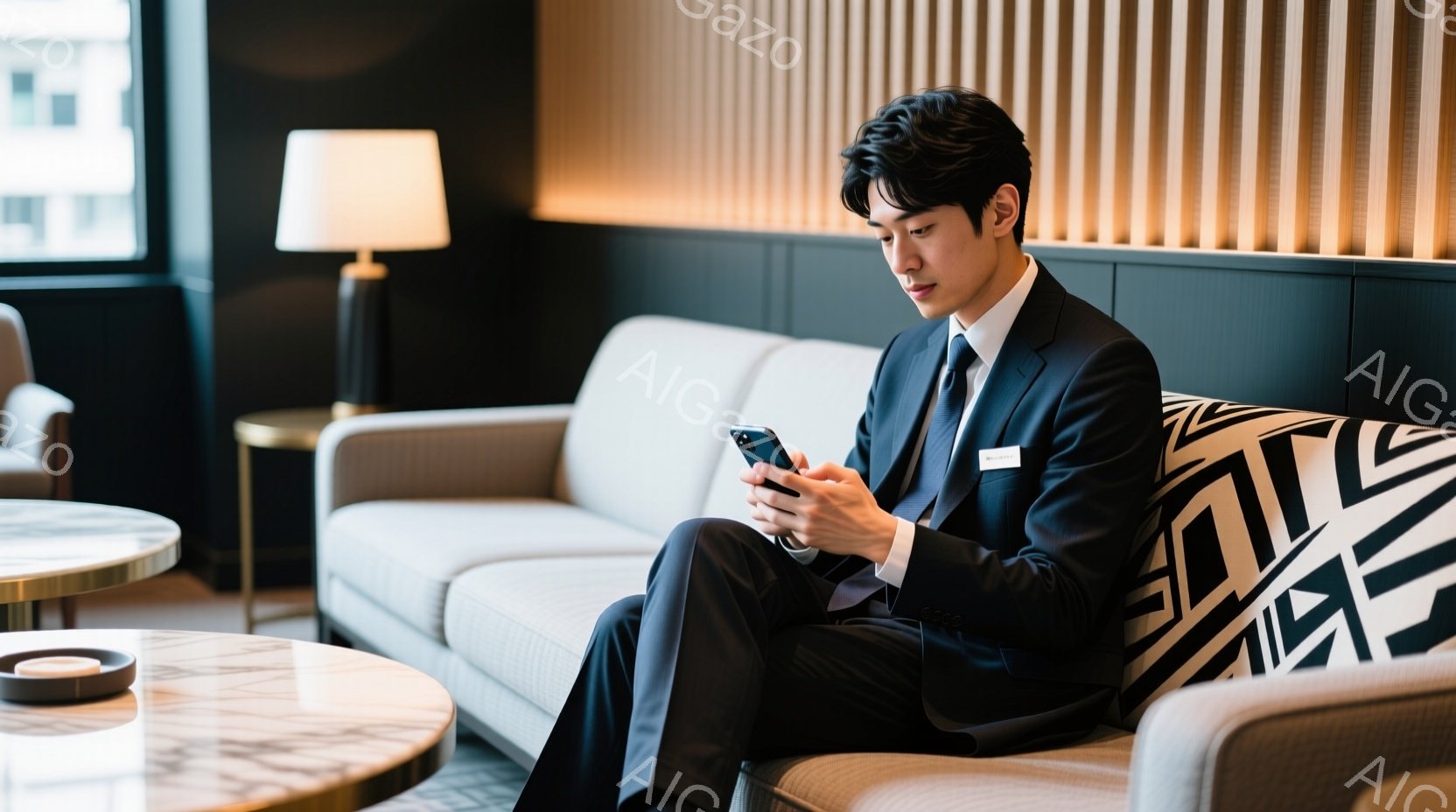 一人の男性がソファーに座ってスマートフォンを見ている。彼は黒いスーツにネクタイをし、髪は短く整えられている。背景には、幾何学模様の装飾が施された壁と、テーブルの上に置かれたコーヒーカップが見え、落ち着いた雰囲気の室内であることがわかる。
