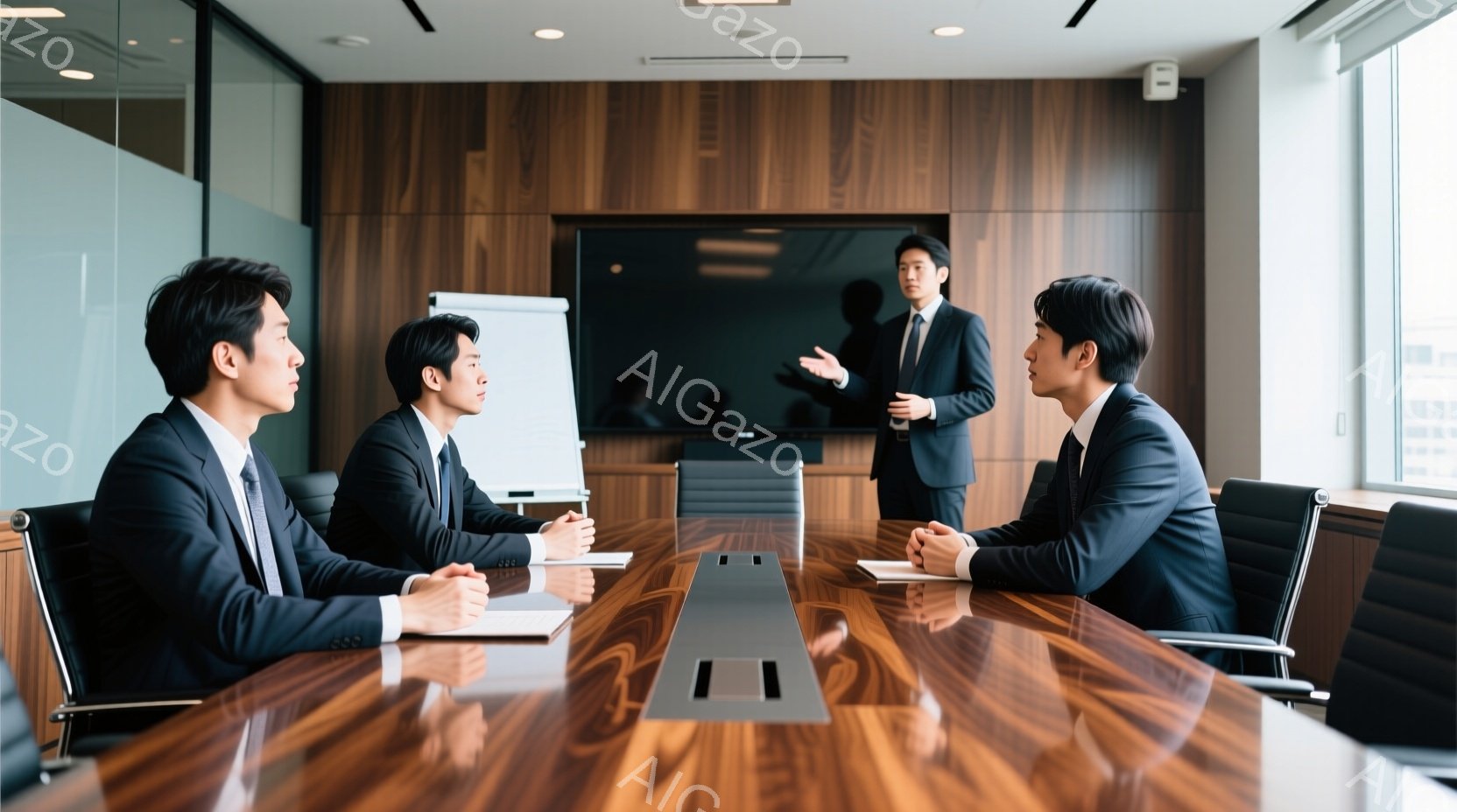 会議室でビジネスマンたちが集まっており、一人がプレゼンテーションをしている。全員が黒いスーツを着ており、髪型は短く整えられている。背景には高層ビルが見え、晴れた日の様子がうかがえる。