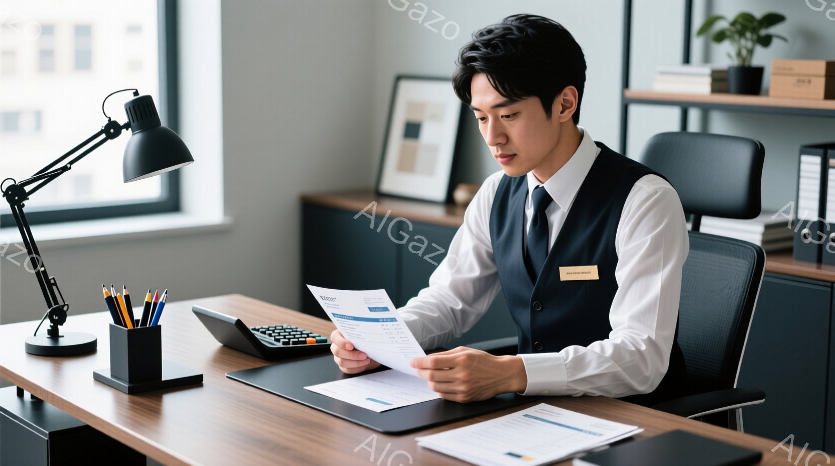 紺色のベストと白いシャツ、黒いネクタイを着用した男性が、木の机に向かって書類を読んでいます。彼は真剣な表情で書類を見つめ、姿勢は正しく、集中している様子が伺えます。背景には、観葉植物や書類が整理された棚が見え、オフィス内の落ち着いた雰囲気が伝わってきます。