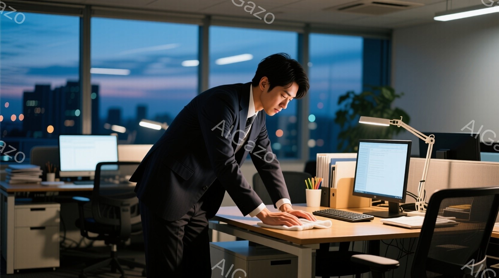 スーツ姿の男性がオフィスでデスクを拭いています。彼は白いシャツにネクタイ、黒いスーツとズボンを着用し、短髪で真剣な表情です。背景には夜景の見える高層ビル群が広がり、オフィス内は整頓されており、全体的に真面目さと集中した雰囲気が漂っています。