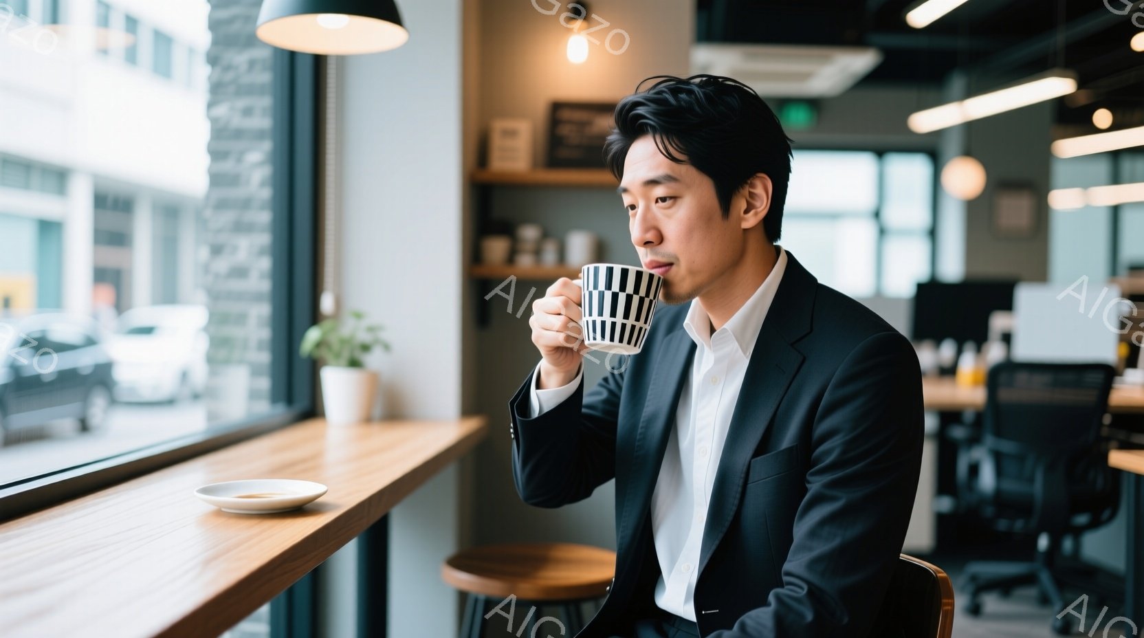 男性は、窓際のテーブルでコーヒーカップを手にしている。紺色のスーツに白いシャツを着ており、髪型は短く、落ち着いた表情をしている。背景には、他のテーブルやオフィスらしき空間が見え、全体的に落ち着いた雰囲気である。