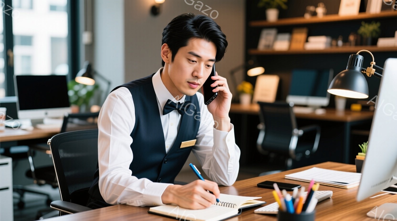 ダークネイビーのスーツに白いシャツ、ネクタイを締め、整髪された男性が、ホテルのロビーで手を振ってこちらを見ている。彼は笑顔で、自信に満ちた姿勢で正面を向いている。背景には、モダンなデザインのソファや受付カウンター、そして幾何学模様の床が広がり、明るく清潔感のある雰囲気が漂っている。
