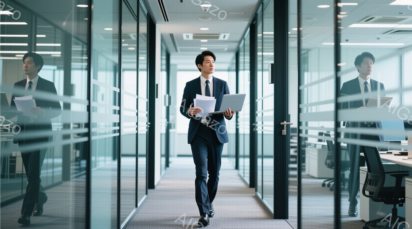 ビジネスマンがオフィス内を歩いており、黒いスーツにネクタイ、短髪のヘアスタイルで、書類とノートパソコンを手にしています。彼の表情は真剣で、自信に満ち溢れています。オフィスはガラス張りの壁で区切られ、清潔感があり、モダンな雰囲気です。