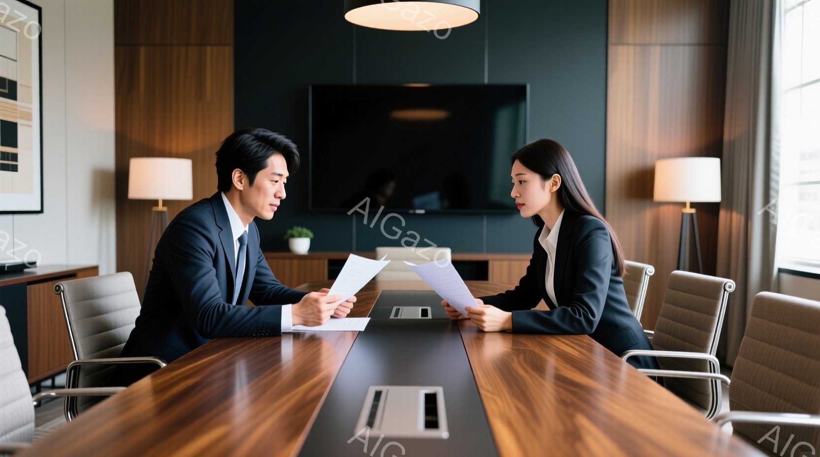 紺色のスーツを着た男性と女性が、円卓を挟んで向かい合って座り、書類を手に持っています。二人は真剣な表情で書類を見つめており、ビジネスシーンを連想させます。背景には、木目調の壁とテレビ、そして間接照明があり、落ち着いた雰囲気の会議室であることがわかります。