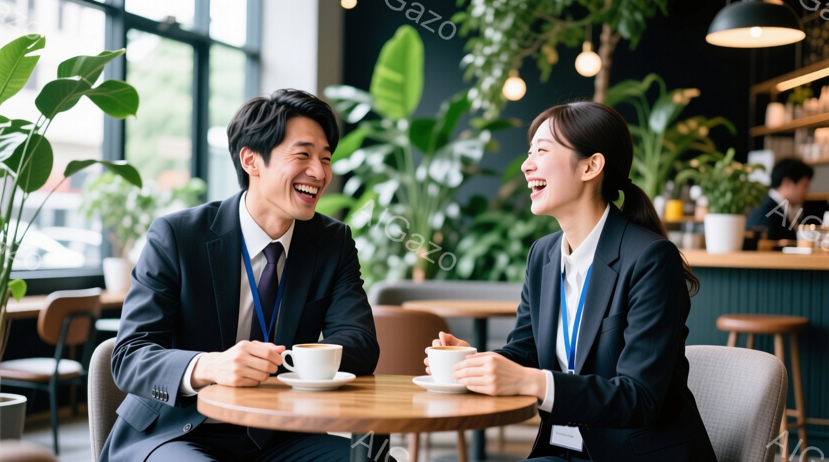 ビジネススーツを着た男女が、コーヒーを飲みながら向かい合って笑顔で話しています。男性は黒髪で、女性はポニーテールにしており、共にネクタイまたは襟元から身分証明書が見えます。背景には緑豊かな植物が配置され、カフェの落ち着いた雰囲気を醸し出しています。