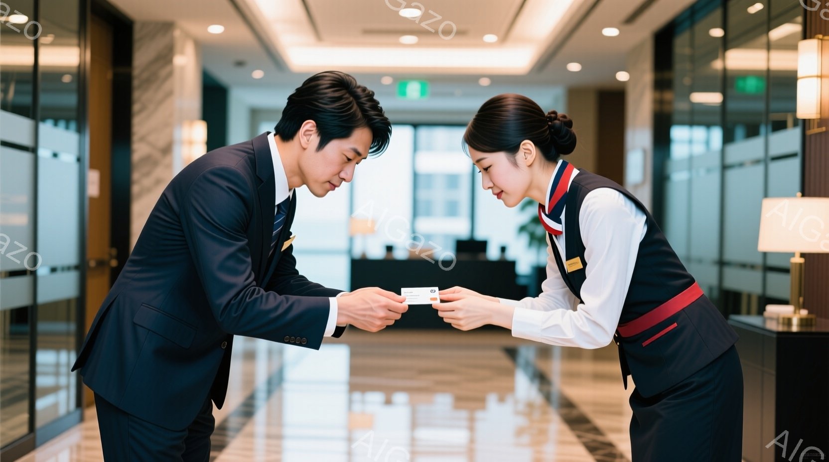 スーツ姿の男性が、ホテルのフロントで女性スタッフから名刺を受け取っています。女性は紺色の制服を着ており、髪を後ろでまとめ、丁寧な姿勢で名刺を差し出しています。背景には、磨かれた大理石の床とモダンなロビー、そして薄い緑色のアクセントの壁が見え、洗練された落ち着いた雰囲気です。