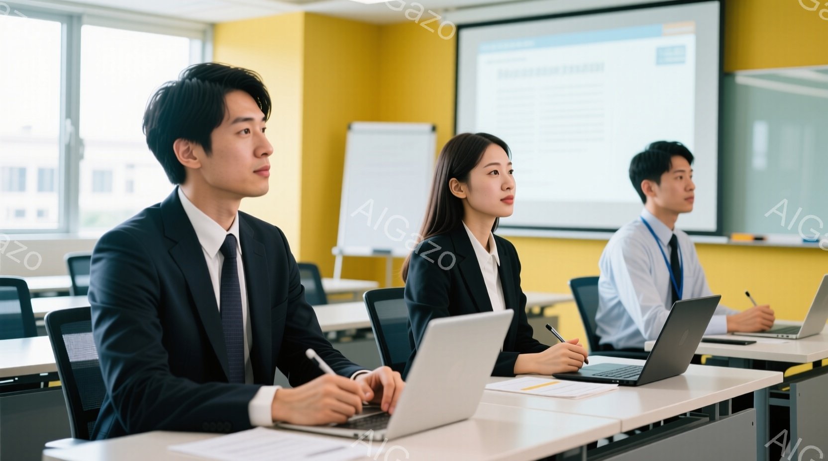 紺色のジャケットと白いシャツを着たビジネスマンと女性が、明るい研修室でノートパソコンに向かっています。女性は髪を後ろでまとめ、少し顎を上げて集中した表情をしています。背景には、白板とカラフルな壁があり、研修やセミナーの様子が伺えます。