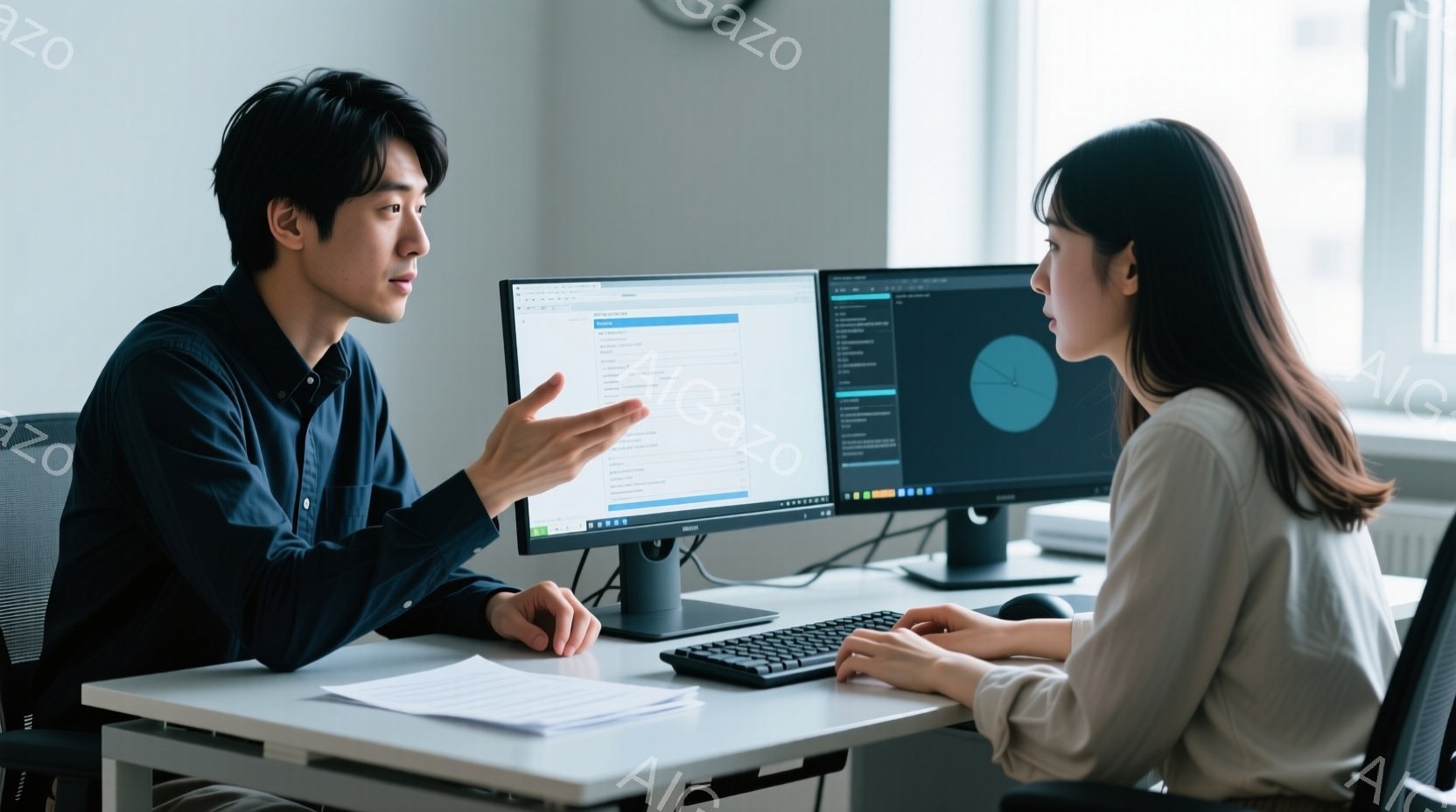 2人のビジネスパーソンがオフィスで対面している。男性は青いシャツを着ており、何かを説明しているようなジェスチャーをしている。女性はベージュ色のブラウスを着てキーボードを操作しており、集中して男性の話を聞いている様子で、背景にはモニターや書類が置かれたオフィス環境が見える。