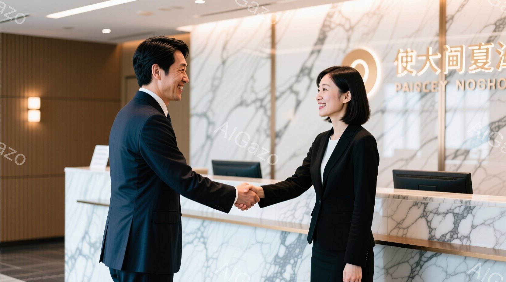 ビジネススーツを着た男性と女性が、ロビーで握手をしています。二人は笑顔で、互いに向き合い、プロフェッショナルな印象を与えます。背景には、大理石調の受付カウンターと、間接照明があり、洗練された雰囲気です。