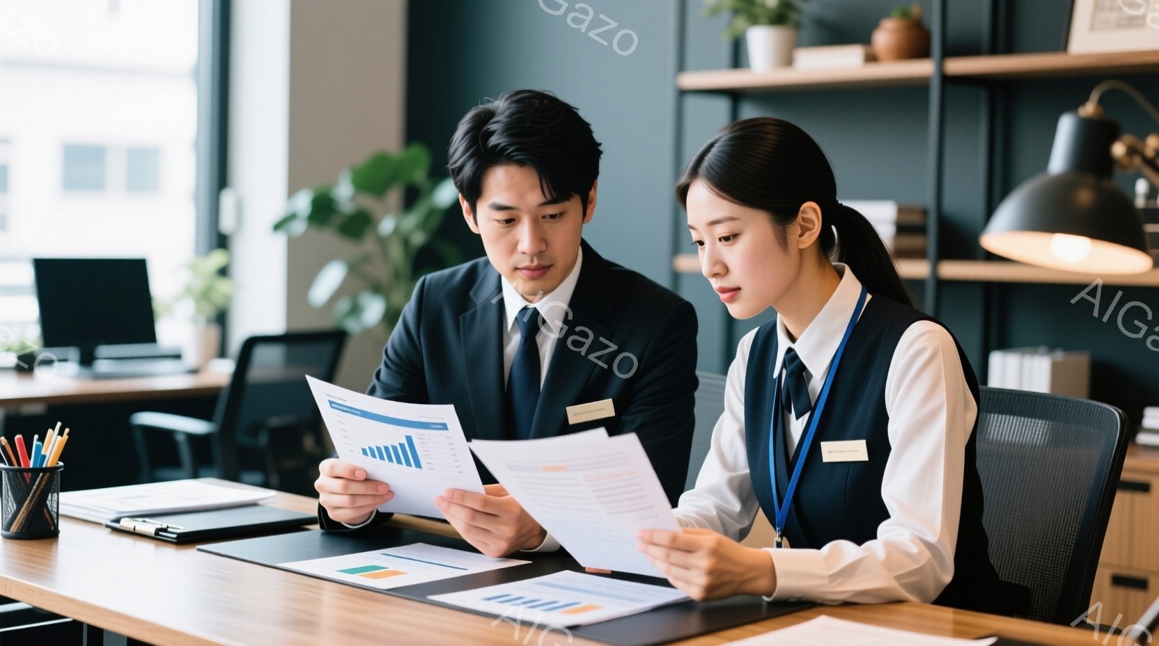 ビジネススーツを着た男性と女性が、オフィスで書類を見ながら何かを議論している様子が写っています。男性は濃い色のスーツで、女性は明るい色のベストとシャツを着用し、真剣な表情でグラフが描かれた書類を手に持っています。背景には本棚とオフィス家具が見え、全体的に落ち着いた雰囲気で、仕事に集中している様子が伝わってきます。