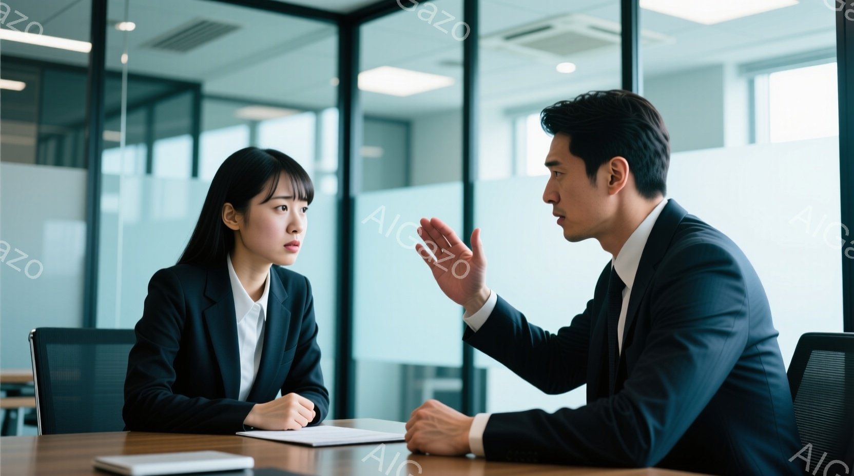 ビジネススーツを着た若い女性と男性が、明るい会議室で向かい合って座っている。女性は片手を上げて何かを説明している様子で、少し真剣な表情をしている。男性は書類を見ながら、女性の話を注意深く聞いているようで、落ち着いた雰囲気である。