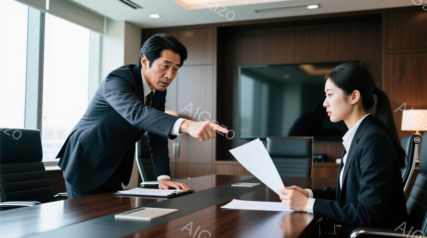 一人の男性と一人の女性が会議室のテーブルを挟んで向き合っている。男性は黒いスーツを着ており、片手を上げて女性を指し示している。女性は同じく黒いスーツで、少し緊張した表情で彼の指示を聞いているように見える。