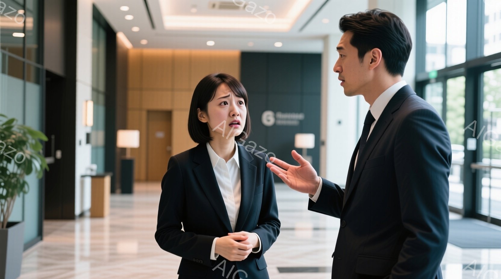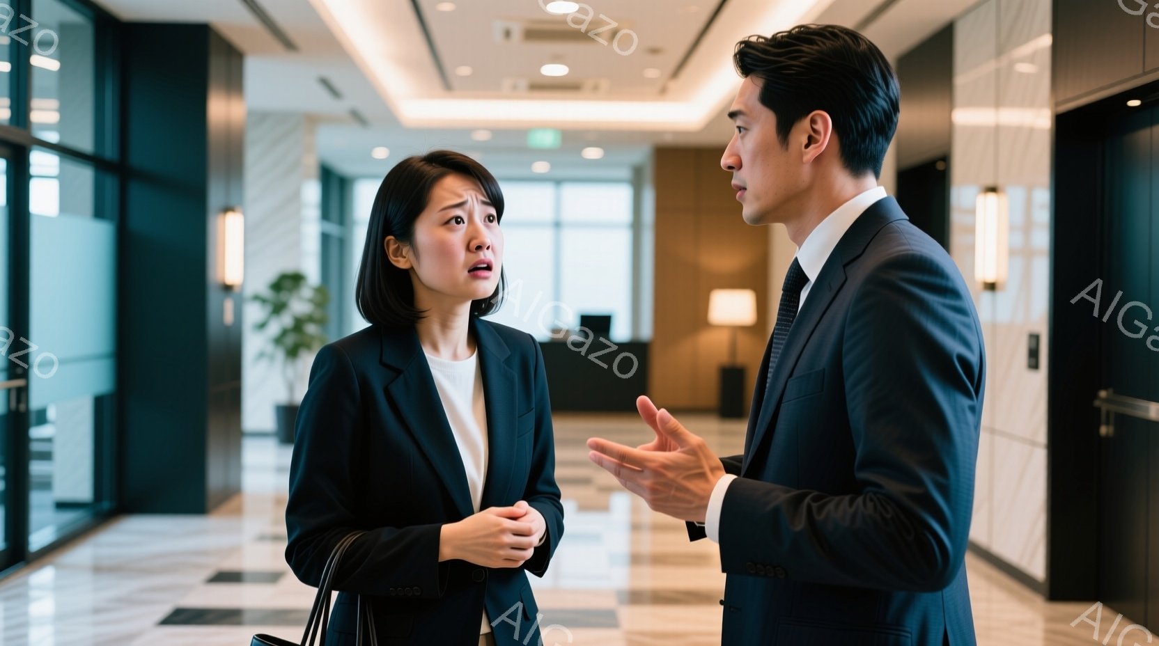 スーツを着た男女が廊下に立っている様子が写っています。女性は黒いスーツで、驚いた表情をしており、男性は身振り手振りをしながら何かを説明しているようです。背景はモダンなホテルの廊下で、ベージュとグレーの落ち着いた色調で、自然光が入っています。