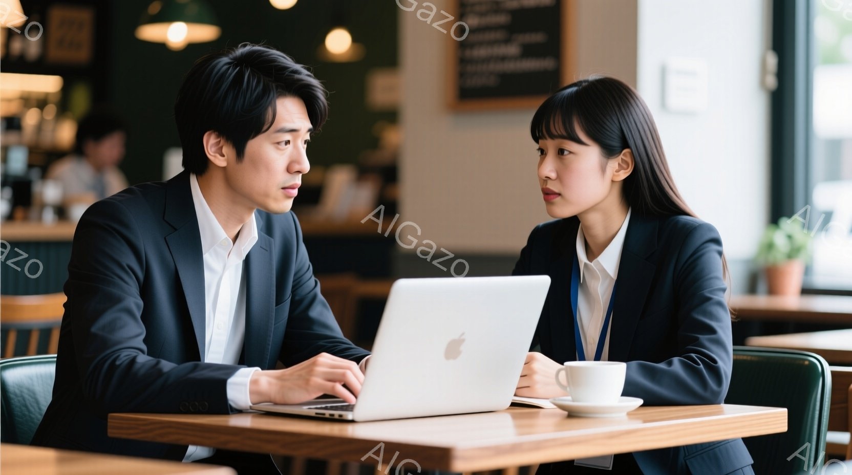 ビジネススーツを着た若い男女が、木製のテーブルを挟んで向かい合って座っています。男性はノートパソコンのキーボードを操作しており、女性は少し眉をひそめ、パソコンの画面をじっと見つめています。背景にはカフェのカウンターや他の客が見え、落ち着いた雰囲気の中で仕事をしている様子が伺えます。