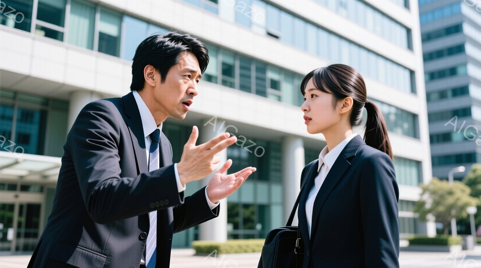 スーツを着た男性と女性が、建物の前に立って何かについて激しく議論している様子がうかがえます。男性は指を立てて何かを指摘しており、女性は厳しい表情で彼を見つめています。背景には近代的な建物が立ち並び、晴天の下、緊張感のある空気が漂っています。