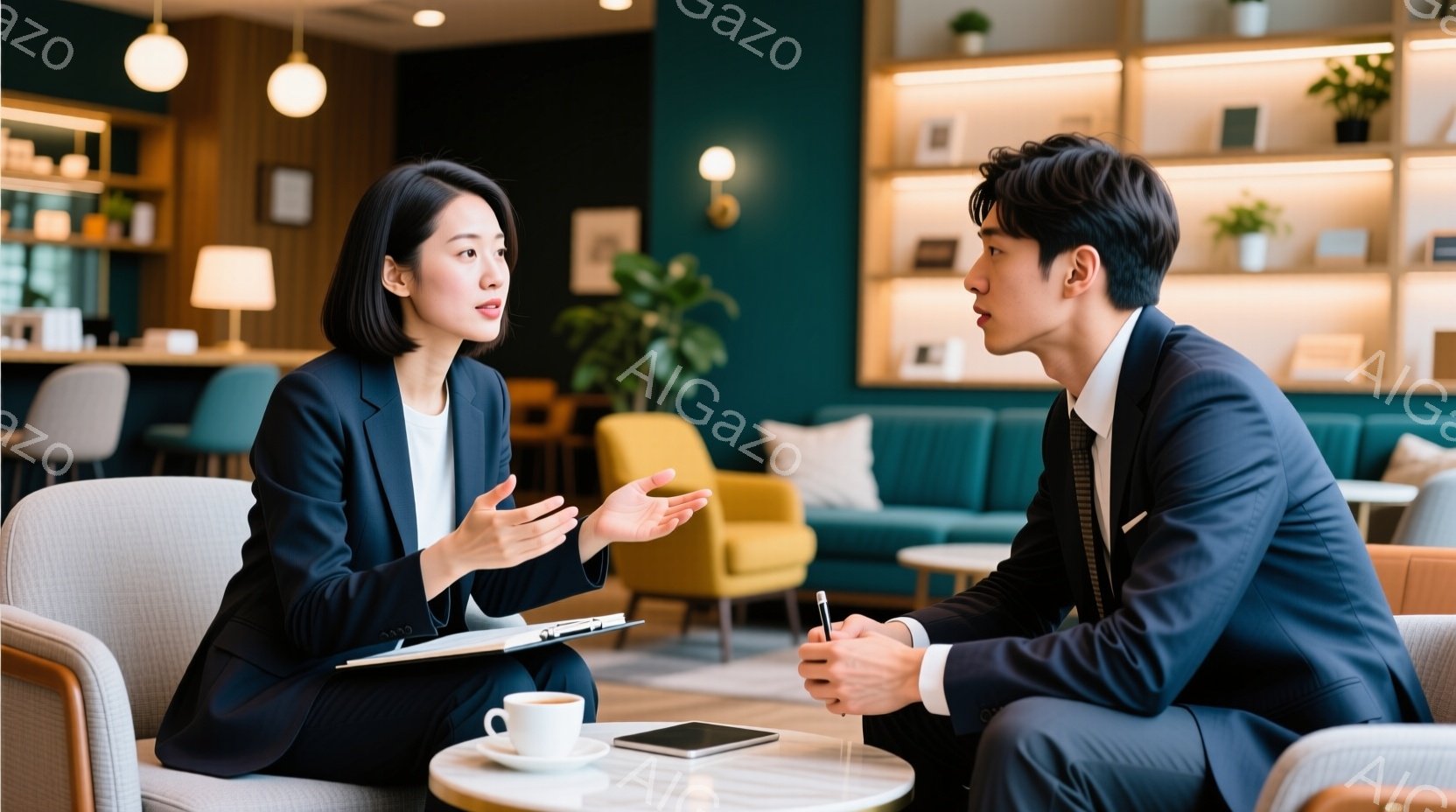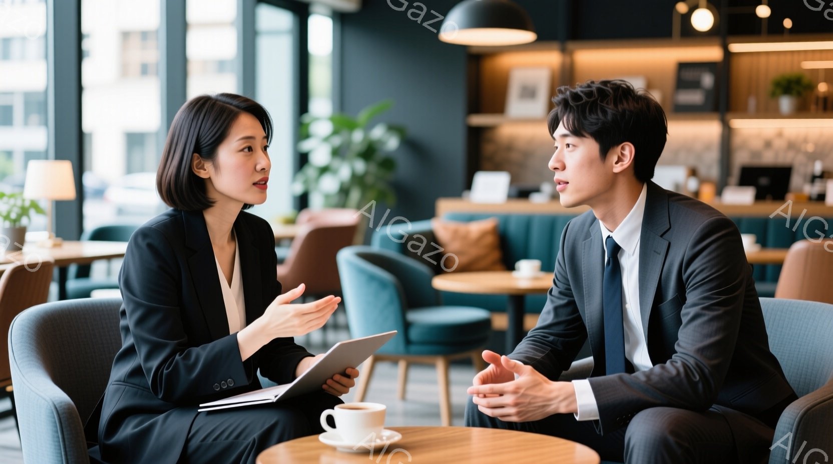 カフェのような場所で向かい合って座っている男女が写っています。女性は黒いスーツを着て髪を後ろにまとめ、何かを説明しているようなジェスチャーをしています。男性は黒いスーツにネクタイをしており、真剣な表情で女性の話を聞いています。
