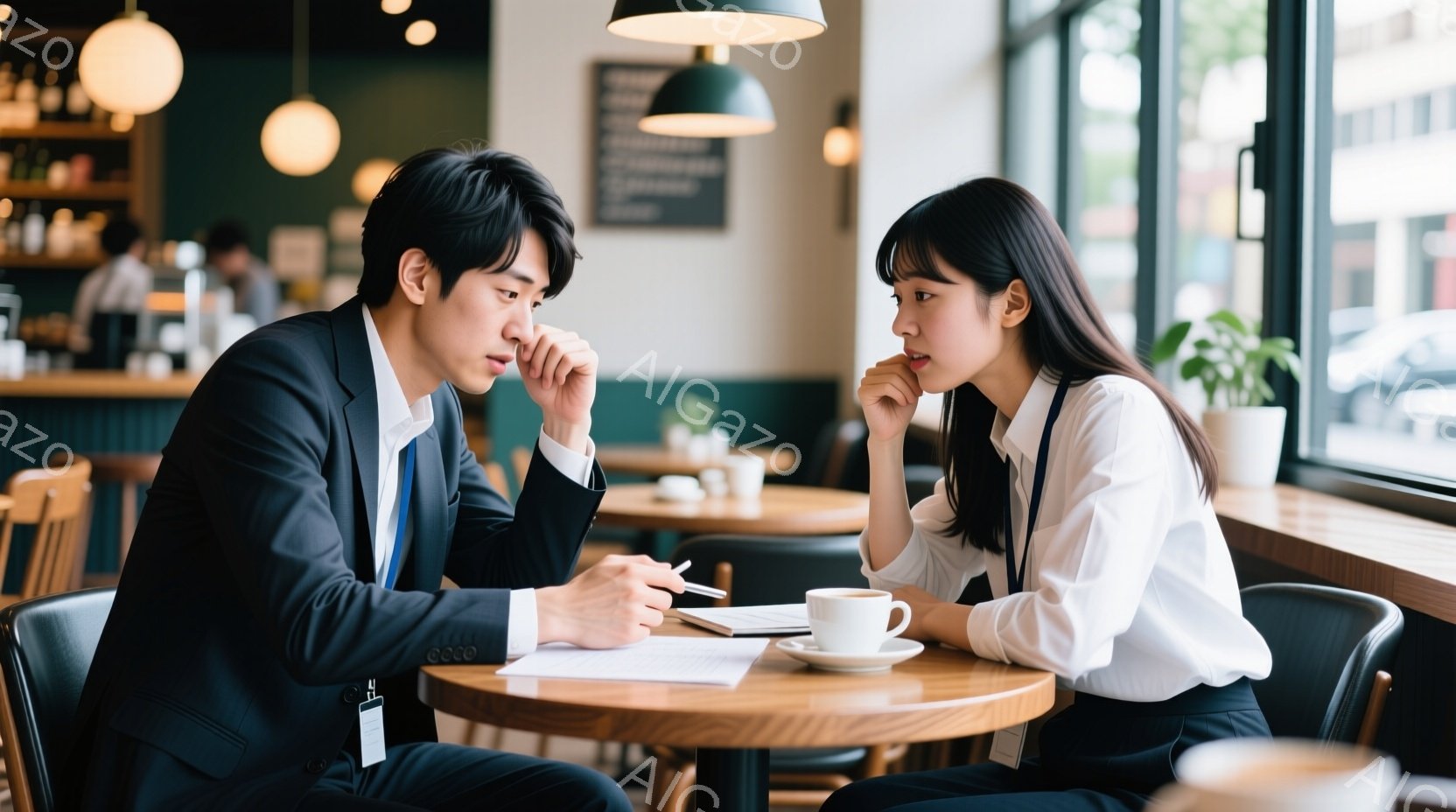 二人のビジネスマンが、窓際のテーブルで向かい合って座り、真剣な表情で話し合っています。男性はダークスーツに白いシャツ、女性は同じくダークスーツに髪を後ろで束ねており、どちらも考え込んでいるような姿勢です。背景にはカフェのカウンターや他の客が見え、晴れた日の穏やかな雰囲気を感じさせます。