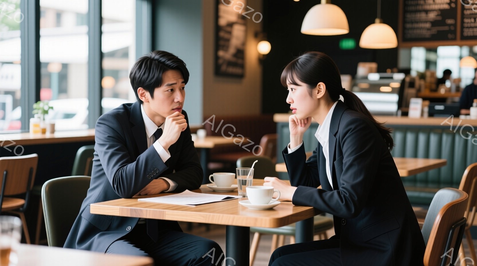 カフェでテーブルを挟んで座っている男女が写っています。男性は黒いスーツにネクタイ、女性は白いシャツと黒いパンツ姿で、どちらも真剣な表情で書類とノートパソコンを見ています。背景にはカフェのカウンターや他のテーブルが見え、落ち着いた雰囲気の中で仕事や打ち合わせをしている様子が伺えます。