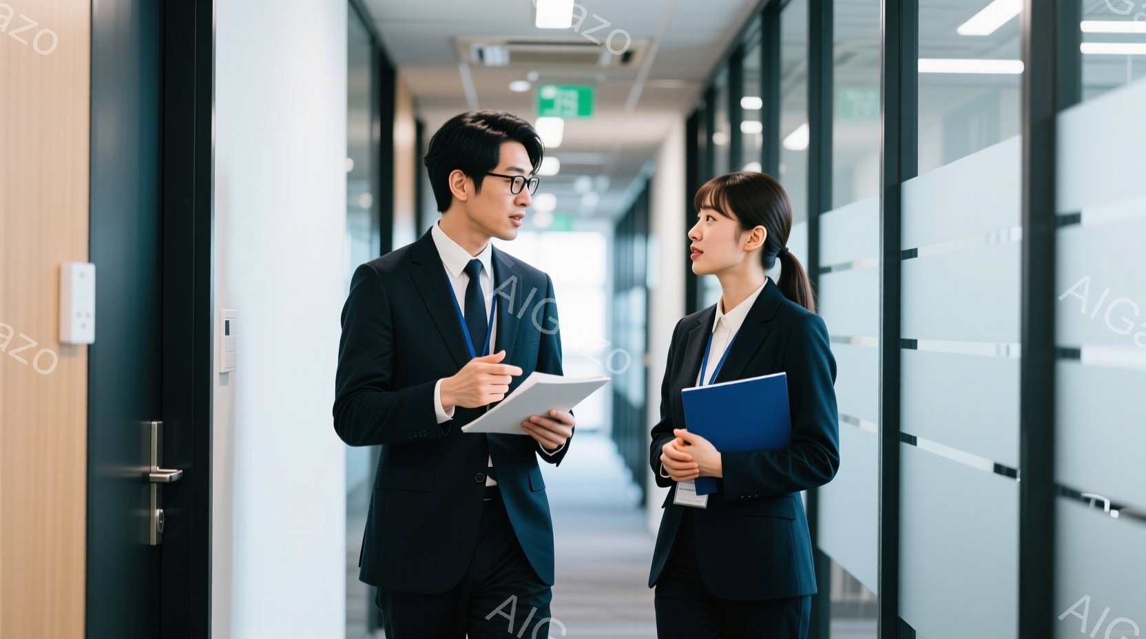 ビジネススーツを着た若い男性と女性が、オフィス内の廊下を並んで歩いている。二人は書類を手に持ち、顔を見合わせて話している様子で、真剣な表情をしている。背景はガラス張りのオフィスで、モダンで清潔感のある雰囲気が漂っている。