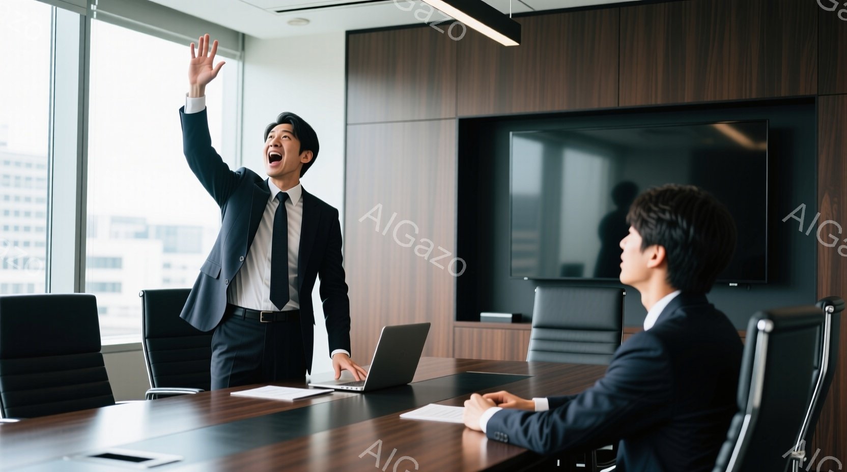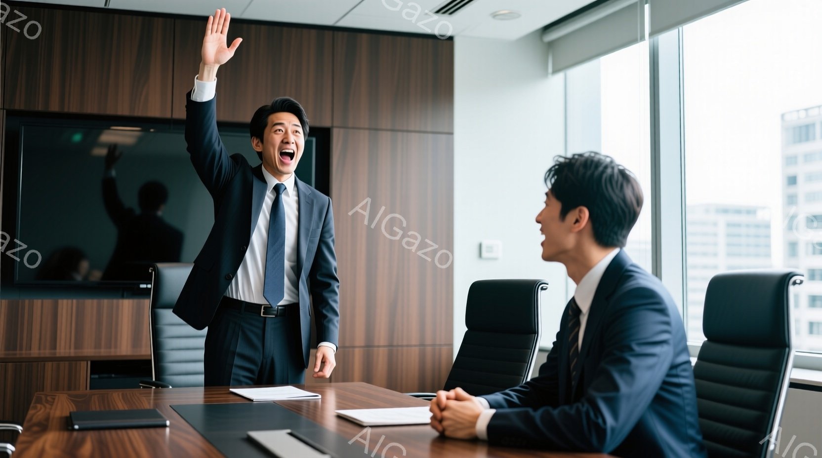 紺色のスーツを着た男性が、片手を高く上げ、興奮した表情で何かを訴えています。対面には、同じく紺色のスーツを着た別の男性が、テーブルに座って手を組み、静かに彼を見つめています。背景には大きな窓から明るい光が差し込み、モダンな会議室の様子がうかがえ、全体的に活気と緊張感が入り混じった雰囲気です。