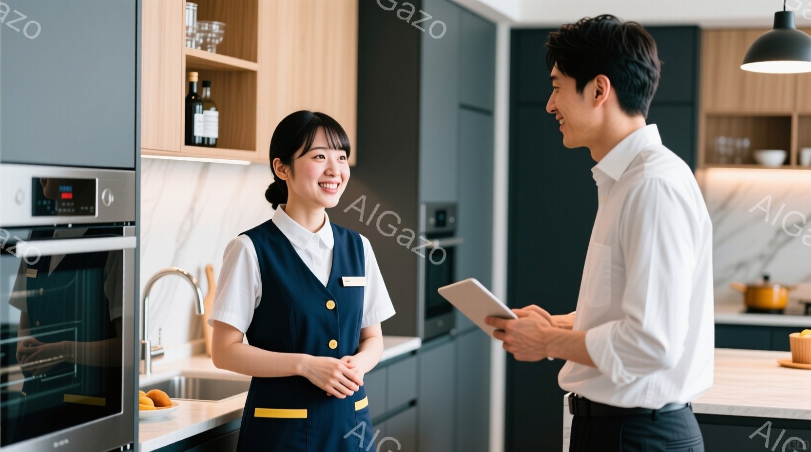 明るいキッチンで、制服を着た若い女性が書類を男性に手渡している。女性は黒髪で、明るい笑顔を浮かべ、エプロンとリボンタイを締めている。背景にはモダンなキッチン設備が見え、全体的に清潔感があり、親しみやすい雰囲気が漂っている。