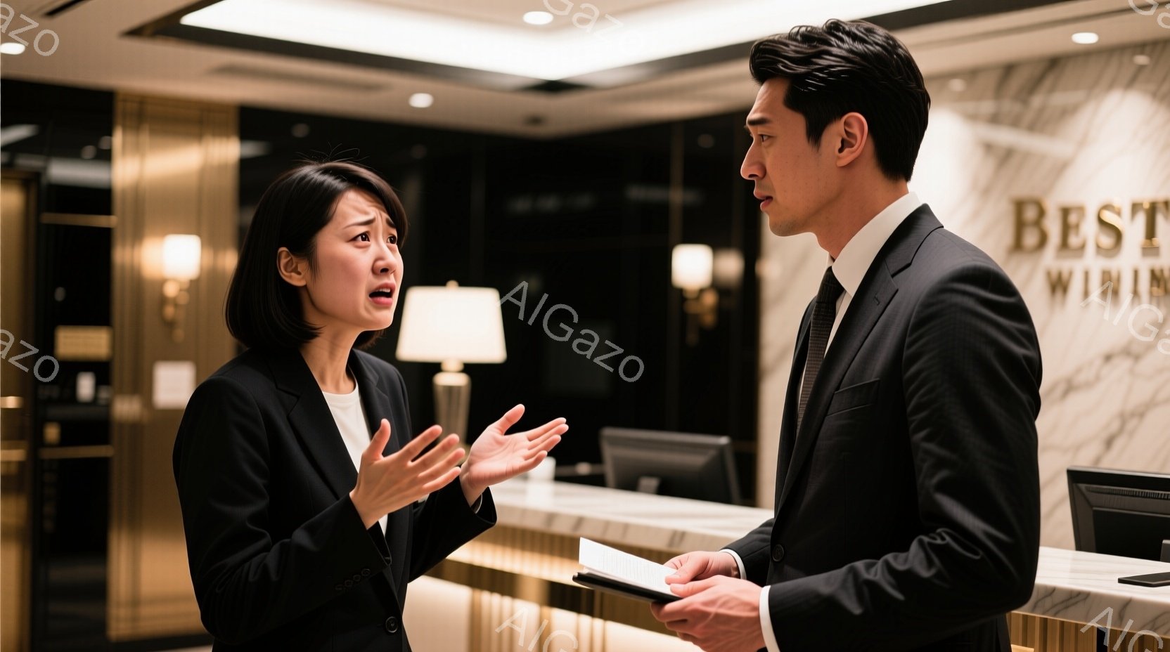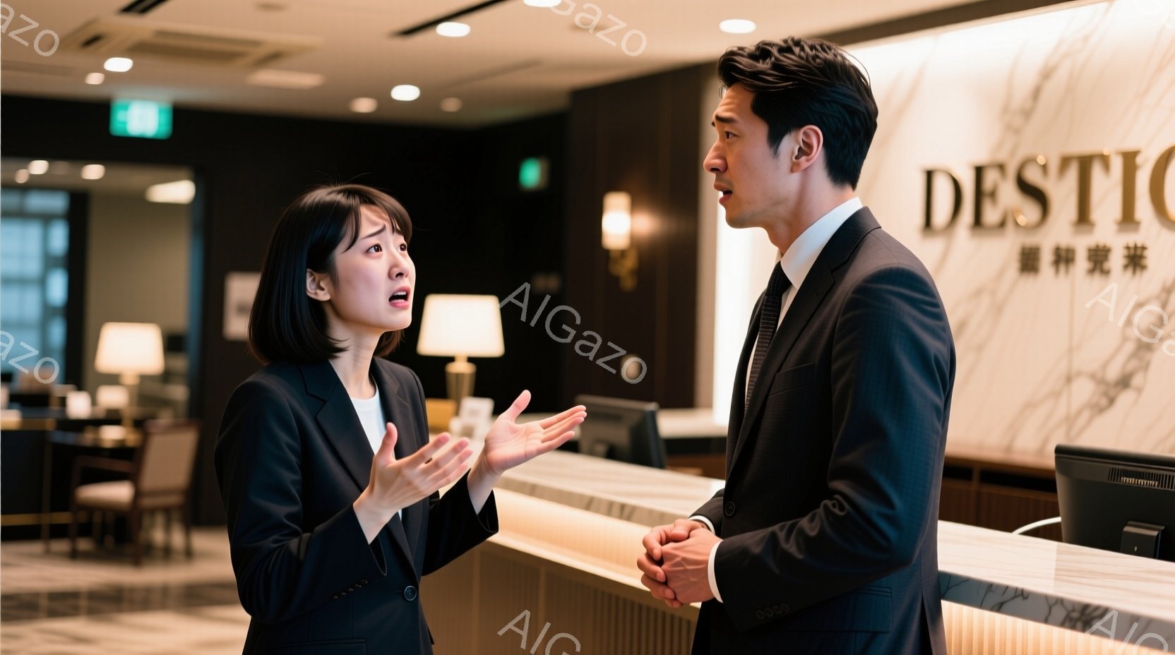 若い女性は白いシャツを着ており、黒髪を肩の長さで切り揃えています。彼女は何かを説明しているようで、少し真剣な表情で手を広げています。背景にはカフェのような内装が見え、年配の男性が彼女の言葉に耳を傾けています。