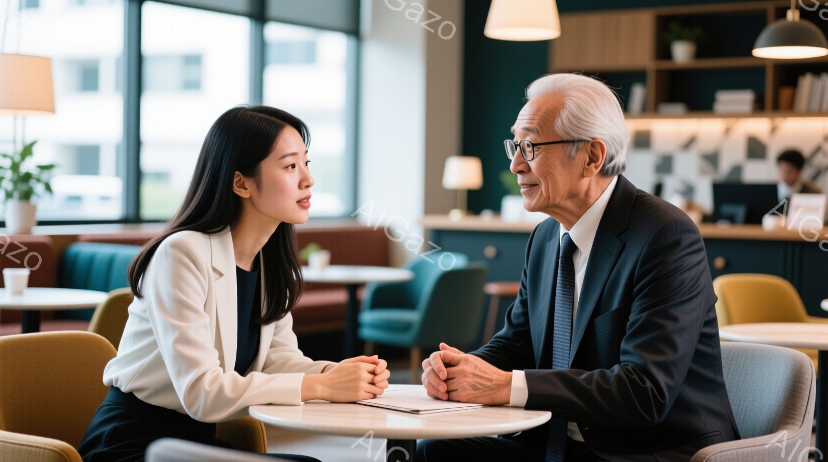 若い女性は白いシャツを着ており、黒髪のショートヘアで、何かを説明しているような表情で手を広げています。年配の男性は紺色のスーツを着ており、手を組んで女性の話を真剣に聞いています。背景はカフェのようで、モダンなインテリアと他の客が見え、二人の間には書類が置かれており、全体的に落ち着いた雰囲気です。