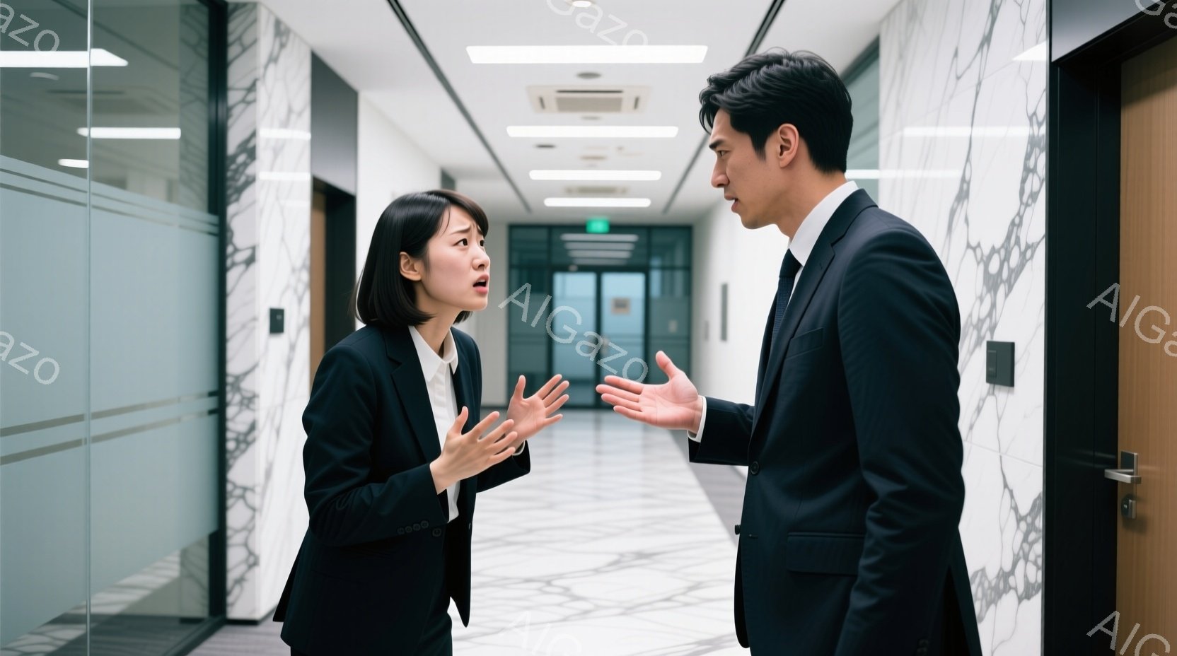 廊下で向き合い、身振り手振りをしながら話している男女が写っています。女性は黒いスーツを着ており、髪は後ろでまとめているが、表情はやや緊張しており、何かを説明しているようだ。男性も黒いスーツを着ており、片手を広げて何かを主張している様子で、両者とも真剣な議論をしている雰囲気です。