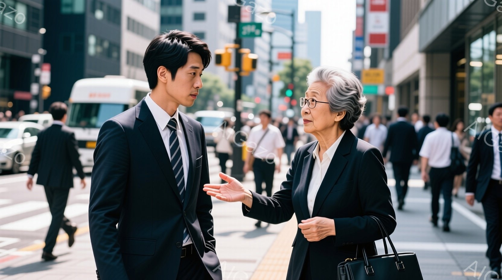 スーツを着た若い男性と、同じくスーツを着た年配の女性が歩道で会話をしています。男性は少し身を乗り出し、女性は手を広げて何かを説明しているような仕草をしています。背景には建物や車が見え、晴天の下、ビジネス街の一コマを切り取ったような賑やかな雰囲気です。