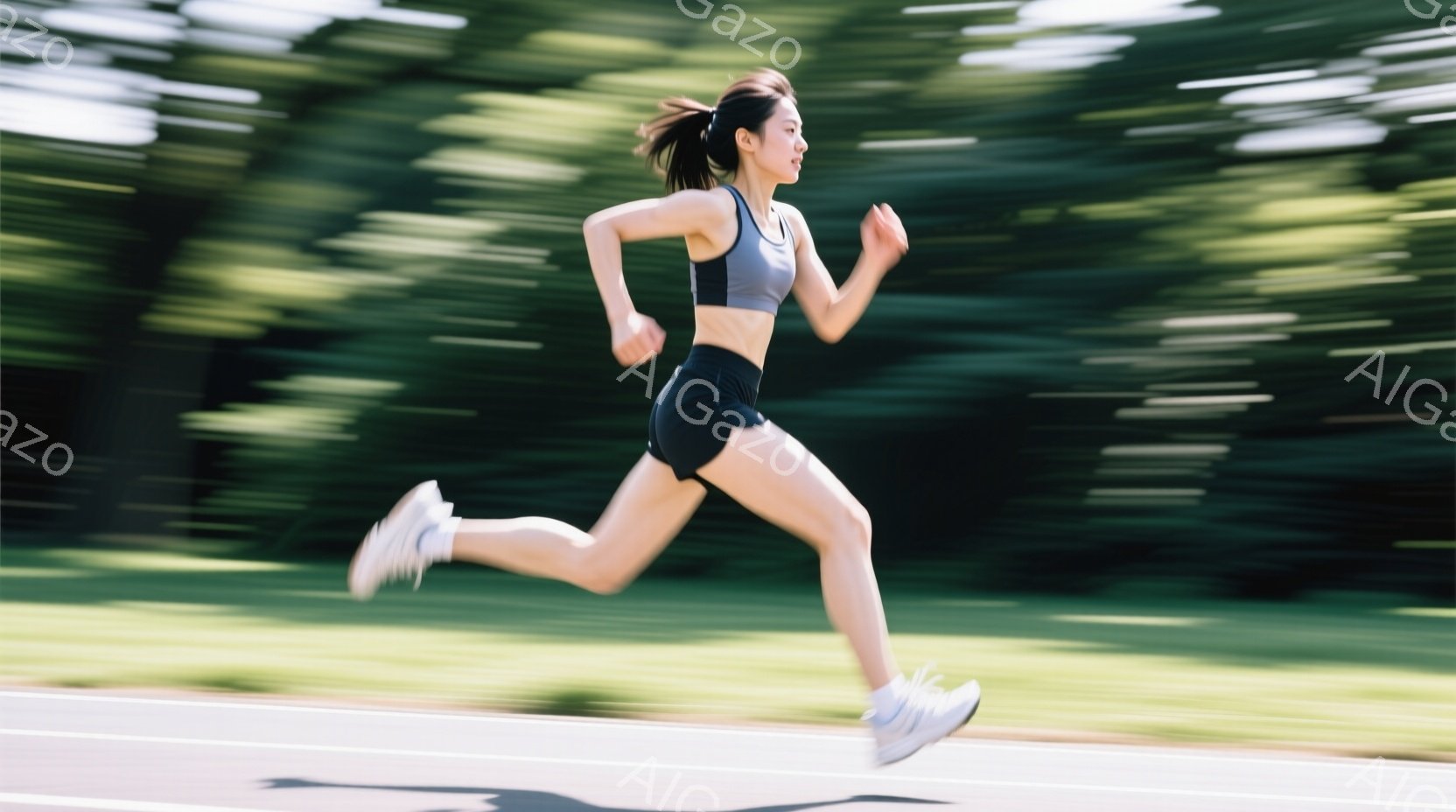 競技場を疾走する女性アスリートが写っている。彼女は黒のスポーツブラと短パンを着用し、髪は後ろでまとめている。背景には緑豊かな木々が見え、天候は晴れで、競技場全体が活気に満ちた雰囲気を醸し出している。