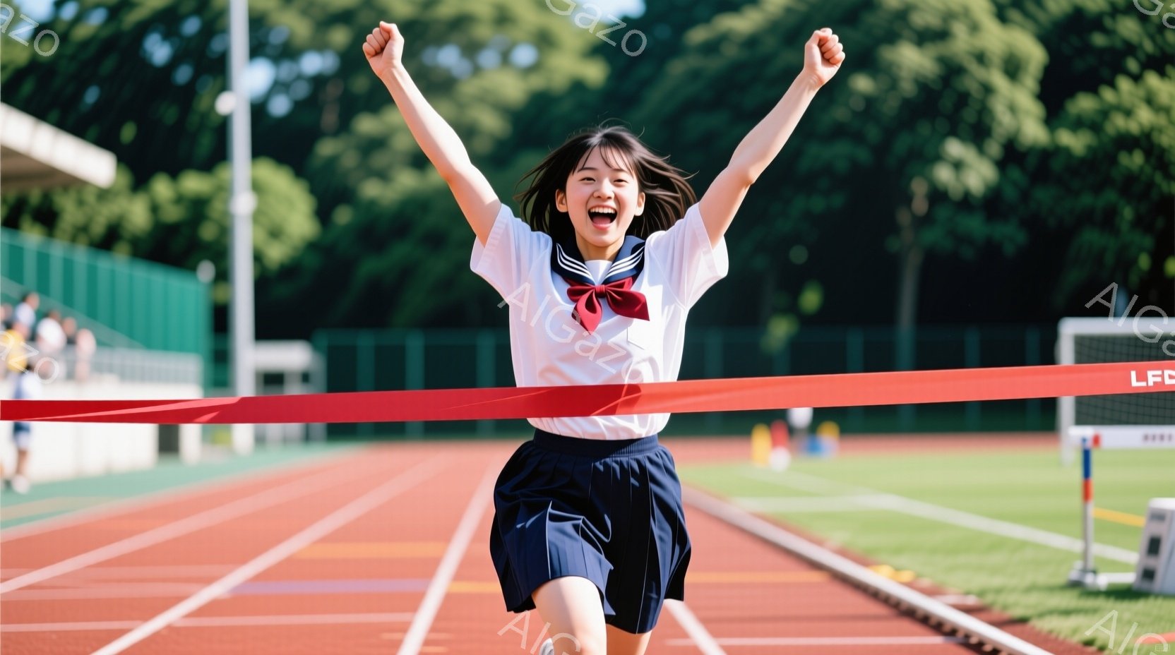 制服姿の女子高生が、フィニッシュラインを駆け抜けている様子が写っている。彼女は両手を高く上げ、満面の笑顔で喜びを表現しており、黒いスカートと白いブラウス、赤いリボンが印象的だ。背景にはトラック競技場と緑豊かな木々が見え、晴天の下、活気と躍動感に満ちた瞬間が捉えられている。