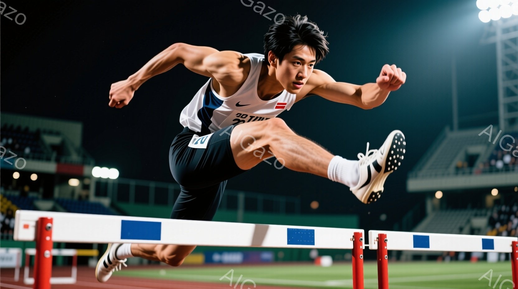 この無料AI生成画像「長い黒髪の陸上競技選手が、砂場に飛び込む瞬間を捉えた写真です。白地に青と赤のラインが入ったシャツと紺色の短パンを着用し、集中した表情で空中で体を大きく広げています。背景には観客席と緑豊かな風景が広がり、晴れた空の下、躍動感あふれるスポーツシーンが展開されています。」は、2025年10月26日に作成されました。 サイズは 1664×928px の高解像度で、商用利用も可能なフリー素材として提供しています。
