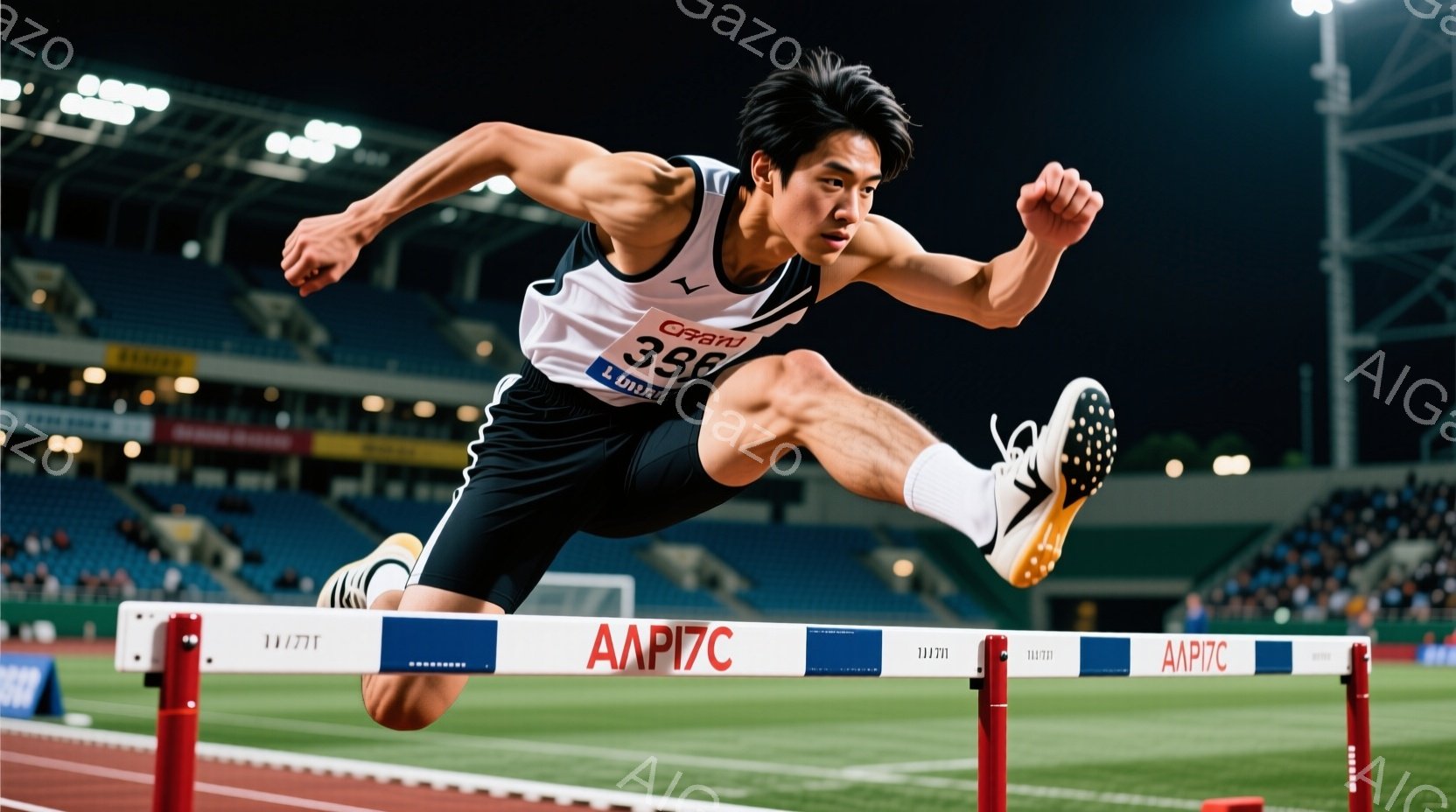 競技者はハードルを飛び越える瞬間を捉えられており、黒髪で引き締まった表情をしている。青と黒のスポーティなユニフォームと、オレンジ色のスパイクシューズを身につけている。背景には夜間のスタジアムの観客席とトラックが見え、躍動感あふれる競技の雰囲気が伝わってくる。