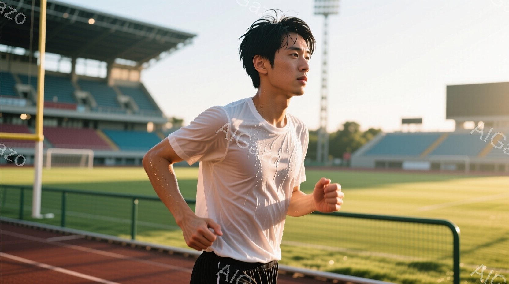 競技場のトラックを走る男性が写っている。白いTシャツと黒いショーツを着用し、短髪で引き締まった表情をしている。背景には青と黄色の観客席と緑のフィールドが広がり、晴天の下、活気のあるトレーニング風景が広がっている。