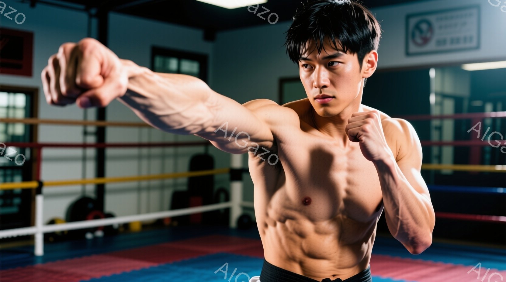 若い男性が武道場のような場所で、白い道着を着て構えをとっている。筋肉質な体格で、右手を前に突き出し、真剣な表情で睨みつけている。背景には畳と壁があり、他の人物もわずかに確認できる、集中と緊張感が漂う雰囲気である。
