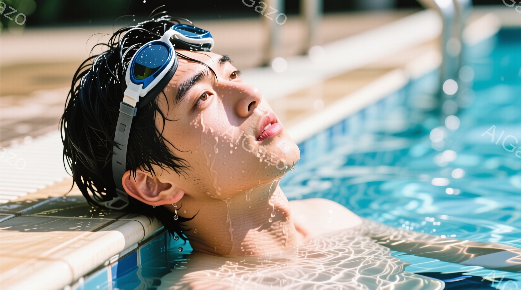 水泳ゴーグルを着用した若い男性が、プールの縁に寄りかかってリラックスしています。水滴が彼の肌を伝い、濡れた髪が額に張り付いています。背景には青いプールの水面と、ぼやけた緑の木々が見え、晴れた日の穏やかな雰囲気が漂っています。