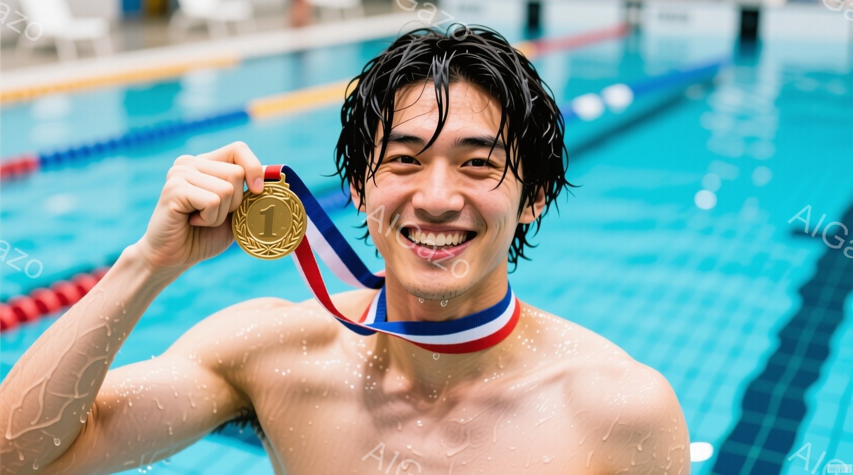 若い男性スイマーが、金メダルを首から下げて満面の笑みを浮かべている。濡れた黒髪を無造作に整え、青と赤のラインが入った白いスイミングジャケットを着用している。背景はプールの水面とタイル壁で、競技が終わった直後の喜びと達成感に満ちた雰囲気である。